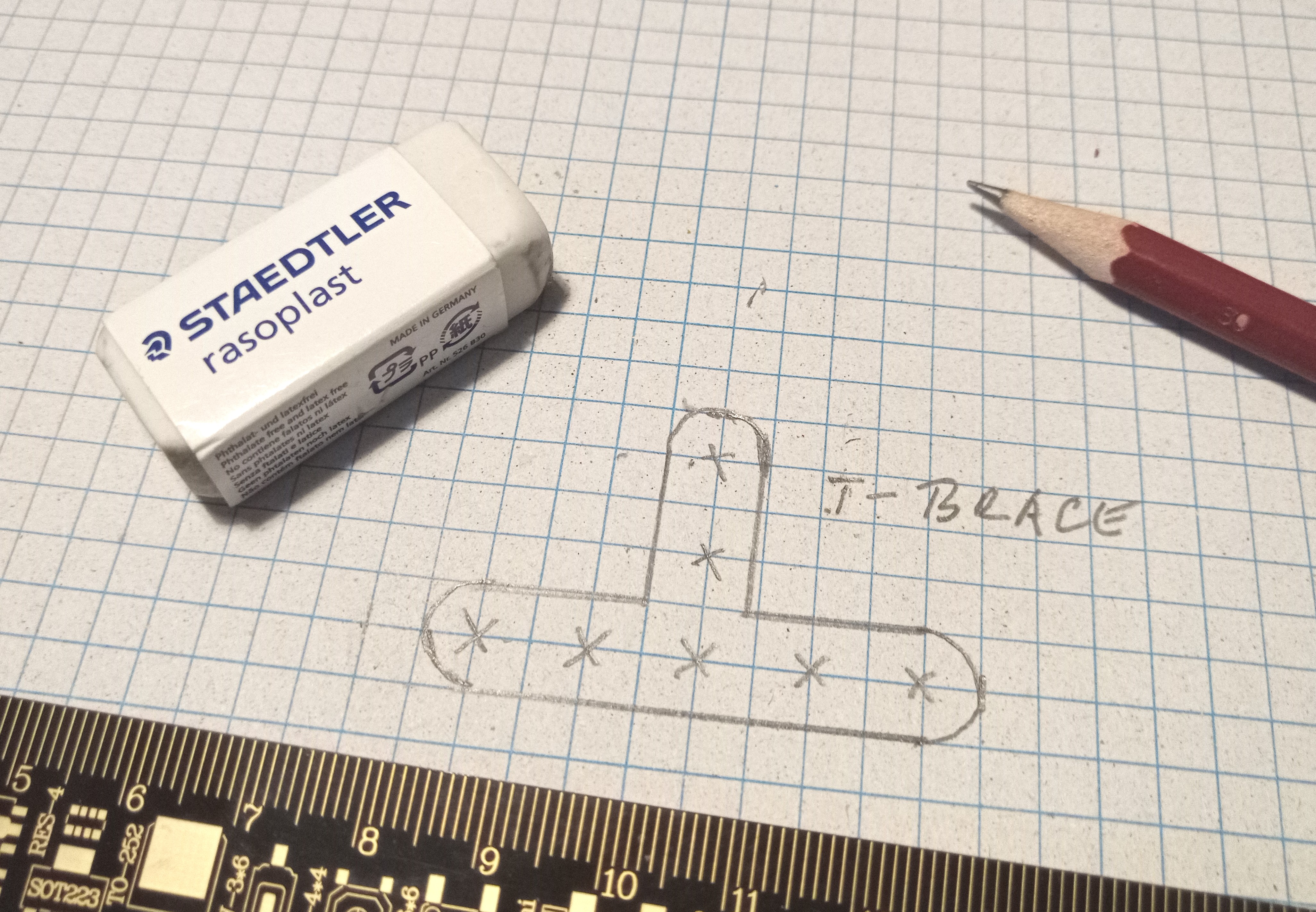 Pri návrhu našej konštrukcie sme zistili, že potrebujeme spojku v tvare T o hrúbke 1/4 BU. Pri návrhu môžeme ako pomôcku na náčrty používať štvorčekový papier s rastrom 5mm (BU/2), na ktorom získame predstavu o skutočnej veľkosti dielov.