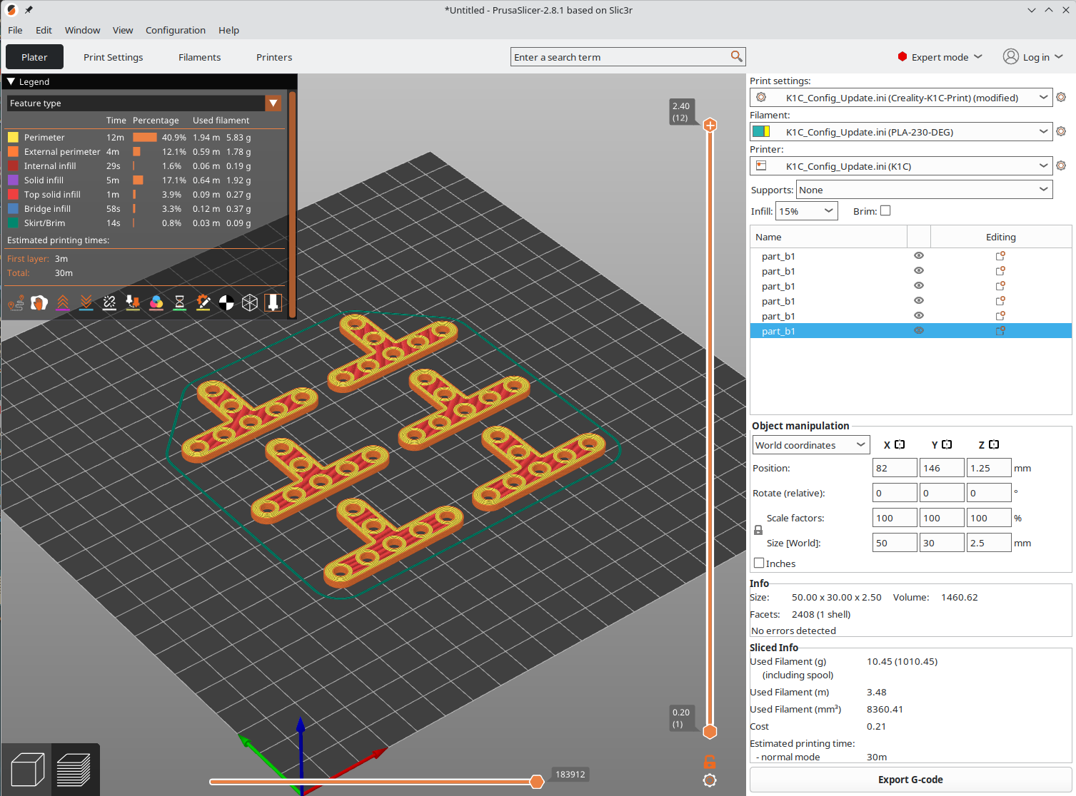 Vytvorené dáta spracujeme programom pre generovani povelového kódu pre 3D tlačiareň (gcode). Presný postup závisí od použitej tlačiarne, na obrázku je spracovanie podkladov pre tlač pomocou programu PrusaSlicer.