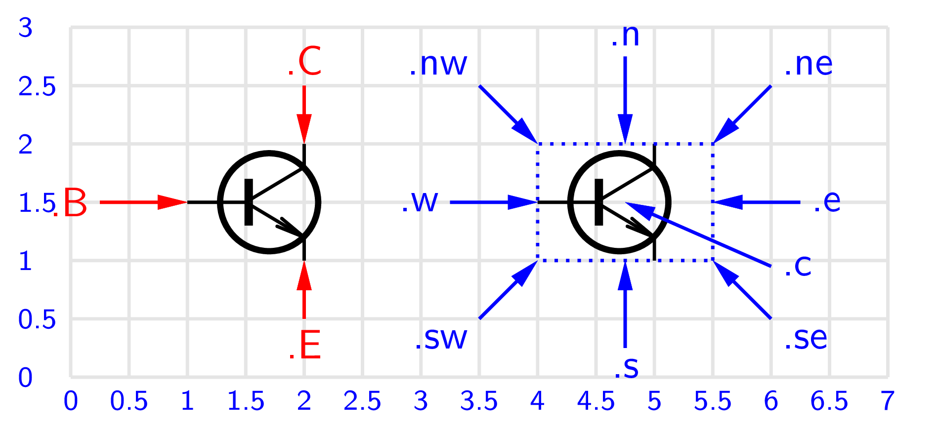Bipolárny tranzistor patrí medzi multipóly a okrem štandardných atribútov definaných pre plošné objekty má naviac atribúty pre určenie polohy vývodov bázy, kolektora a emitora. Bipolárny tranzistor z knižnice CircuitMacros zobrazuje makro bi_tr(), Obr. 77: