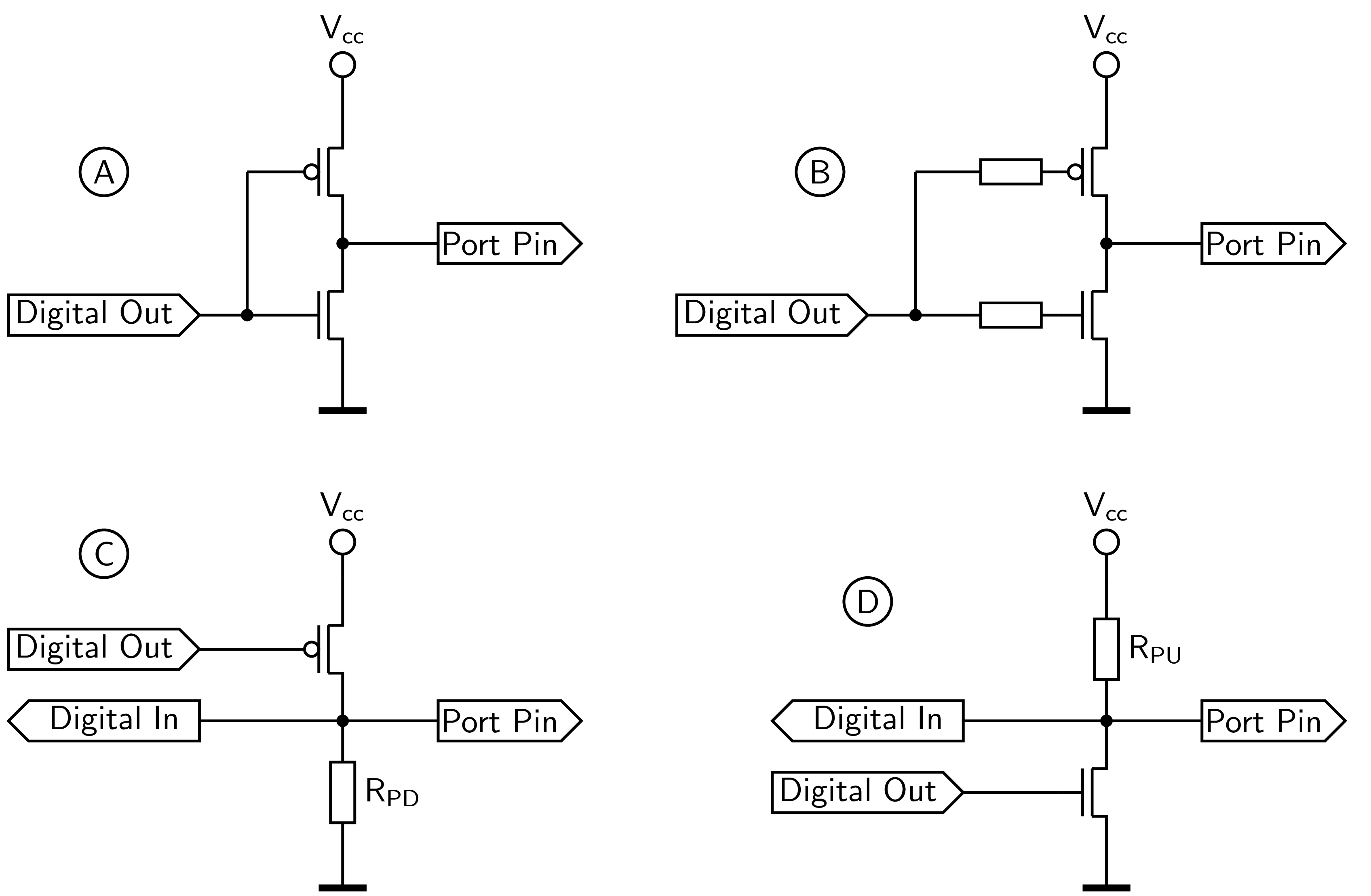 Niektorí výrobcovia mikrokontrolérov používajú pre zjednodušený popis funkcie častí logického obvodu kombinovanú značku FET tranzistora, ktorá namiesto jeho štruktúry zobrazuje jeho vzťah k ostatným častiam zapojenia. Tranzitor s vodivosťou typu P je zobrazený s krúžkom na hradle, čo znamená, že bude otvorený pri privedení signálu s úrovňou L na jeho hradlo, Obr. 90: