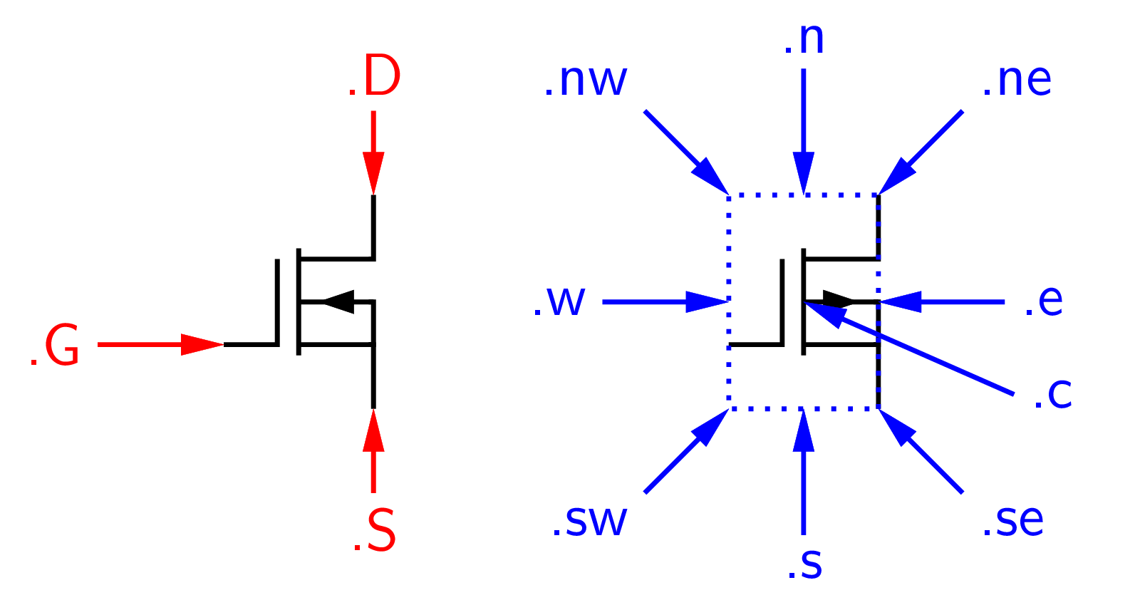 Pre kreslenie vnútorného zapojenia integrovaných obvodov alebo zjednodušené zapojenia častí zapojení sa používajú značky tranzistorov bez púzdier a so skrátenými vývodmi. Pre presné umiestňovanie takýchto prvkov je potom potrebné použiť konštrukciu with … at s deklarovaním vývodu, ku ktorému sa umiestnenie značky vzťahuje, Obr. 85: