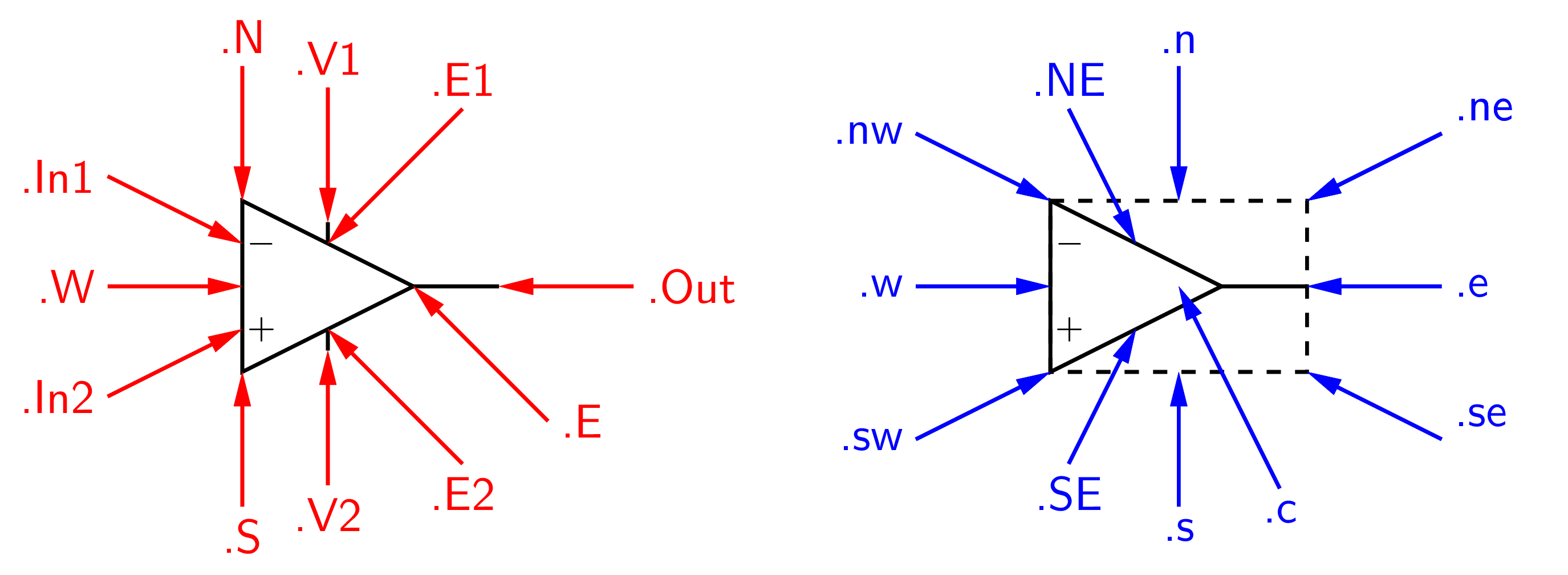 Operačné zosilovače patria v CicuitMacros medzi multipóly a podobne pri ako iných multipóloch ich vývody nie sú uložené v celočíselnej mriežke. Okrem štandardných atribútov pre plošné objekty (.s, …) sú súčasťou prvku doplnkové atribúty (.NE ..,) pre pozície bodov na značke a atribúty pre prístup k vývodom zosilovača. Atribúty pre pripojenie napájacích vývodov (.V1, .V2) sú dostupné len pri použití parametra P, Obr. 92: